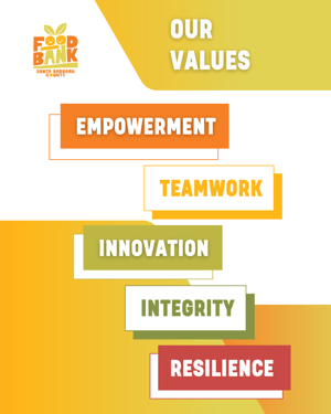 At the Foodbank of Santa Barbara County, our mission transcends any political or social divisions. We recognize a fundamental truth: every person needs food to survive and thrive, regardless of their background, beliefs, or circumstances. Our work is guided by five core values that shape everything we do.